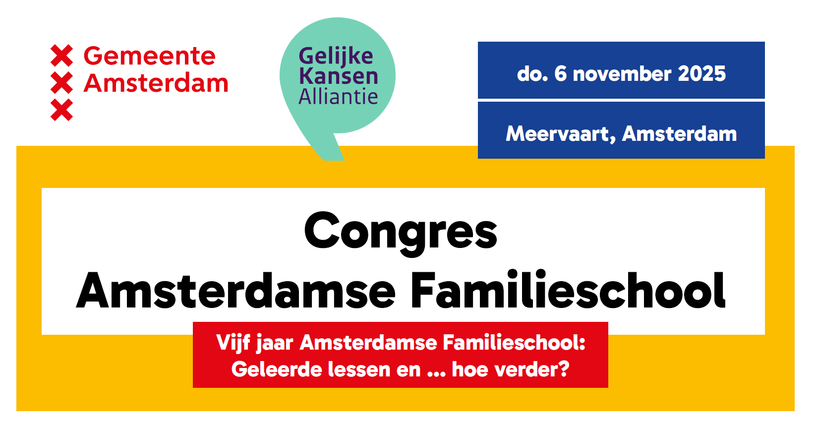 De Amsterdamse Familieschool: van een vernieuwend initiatief naar een impactvolle beweging. Al 5 jaar bouwen we aan kansengelijkheid voor ieder kind en iedere jongere. Tijd om terug te blikken op wat er is bereikt én vooruit te kijken naar wat nodig is om kansengelijkheid voor elk kind te realiseren. Daarom organiseren de Gemeente Amsterdam en de Gelijke Kansen Alliantie het Familieschool Congres. Na de zomervakantie opent de inschrijving.